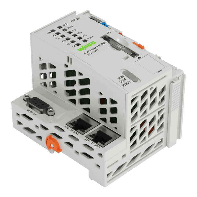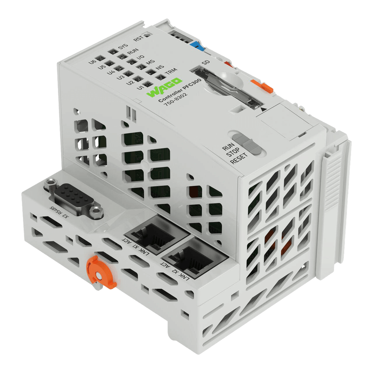 Der Controller PFC300 ist eine kompakte Steuerung für das modulare WAGO I/O System. Neben den Netzwerk- und Feldbus-Schnittstellen unterstützt er digitale und analoge Module sowie Sondermodule der Serien 750/753.